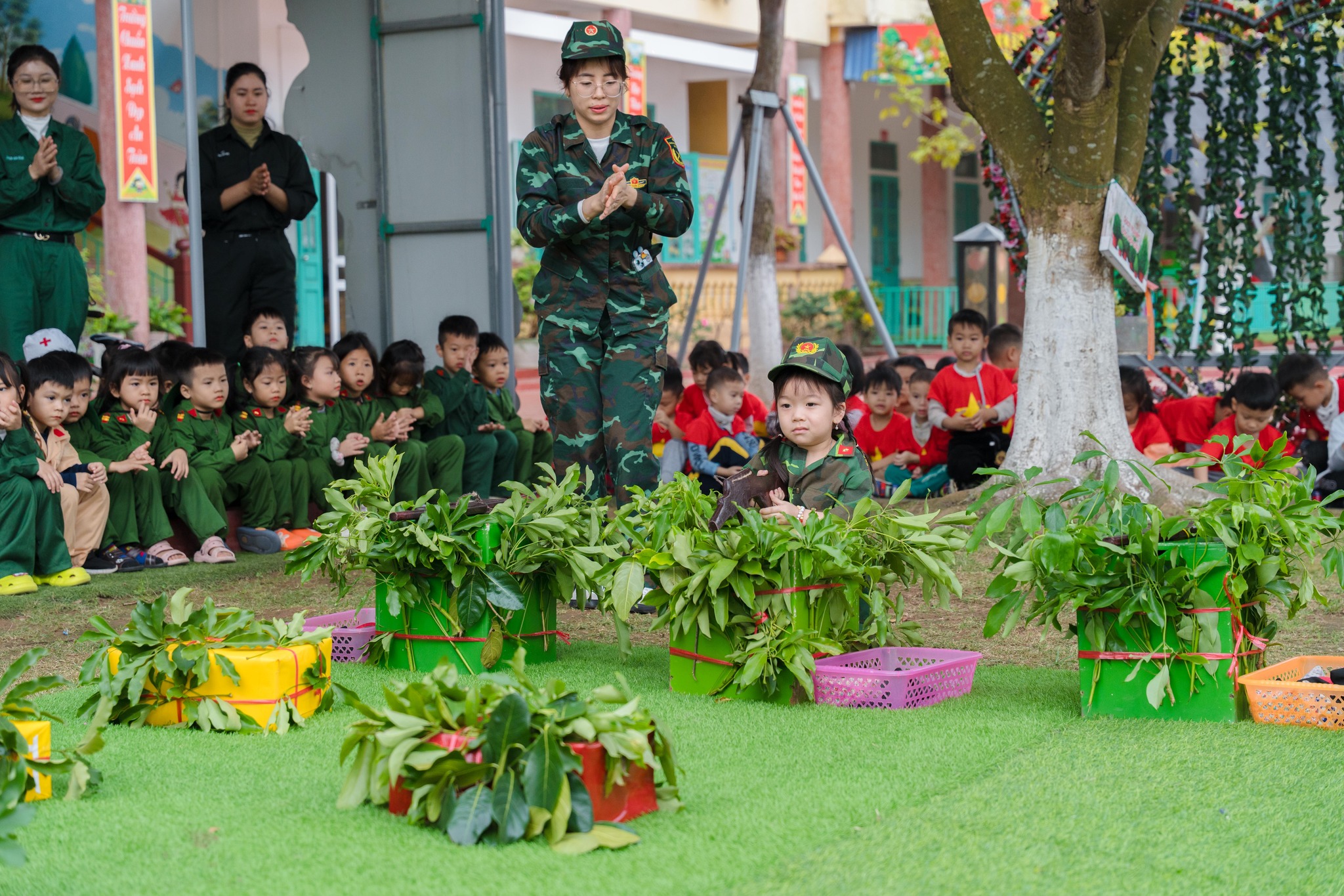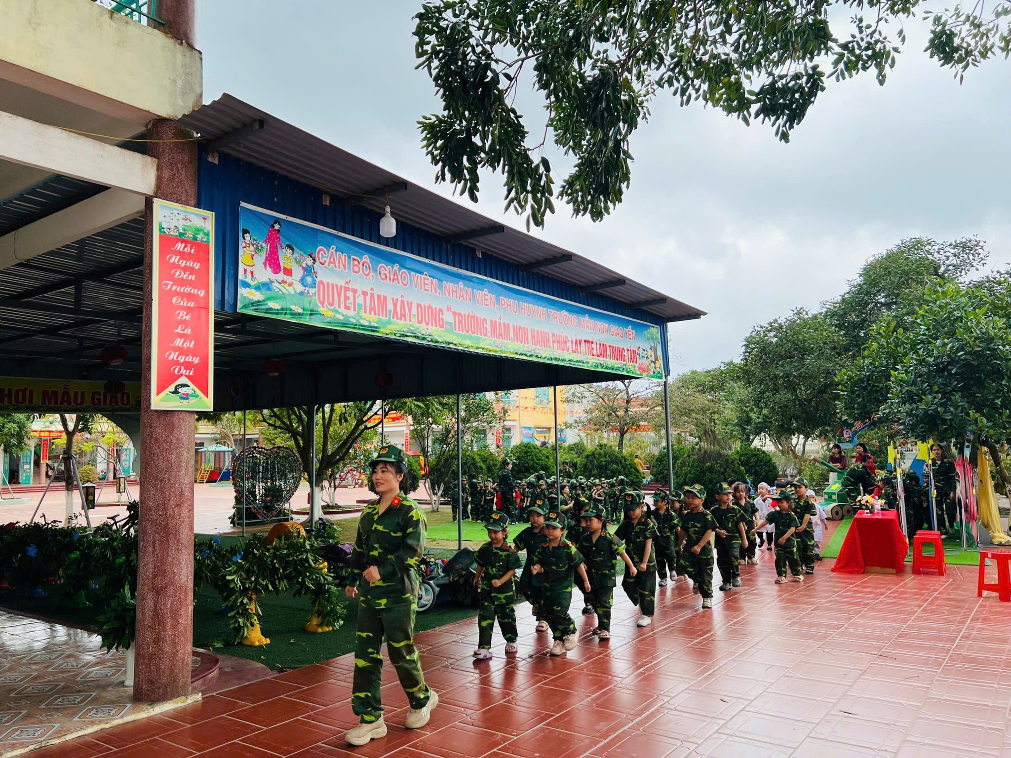 Nhân dịp kỷ niệm Ngày thành lập Quân đội Nhân dân Việt Nam 22/12, thực hiện KH nhiệm vụ năm học 2025 – 2026, tiếp tục thực hiện chủ đề năm học “Đổi mới, sáng tạo nâng cao chất lượng đoàn kết, kỷ cương”. Với các hoạt động giáo dục gắn với các sự kiện lớn của đất nước. Chào mừng 81 năm ngày thành lập quân đội nhân dân Việt Nam 22/12 nhằm tạo cho các bé sân chơi bổ ích cũng là hoạt động trải nghiệm mang tính giáo dục cao. Giúp trẻ hiểu thêm về cuộc sống sinh hoạt của các chú bộ đội, thêm yêu quý, biết ơn những chiến sĩ quân đội nhân dân Việt Nam. Hôm nay ngày 22/12/2025 trường mầm non Giao Yến tổ chức hoạt động trải nghiệm “ Bé tập làm chiến sĩ” giúp trẻ được trở thành những cô chú bộ đội thông qua nhiều hoạt động khác nhau, nâng cao thể chất, phát triển các tố chất nhanh, mạnh, bền, khỏe, tăng cường tính độc lập, tự chủ, mạnh dạn, tự tin, khéo léo, tích cực; rèn luyện kỹ năng phối hợp hoạt động tập thể, tinh thần đoàn kết.